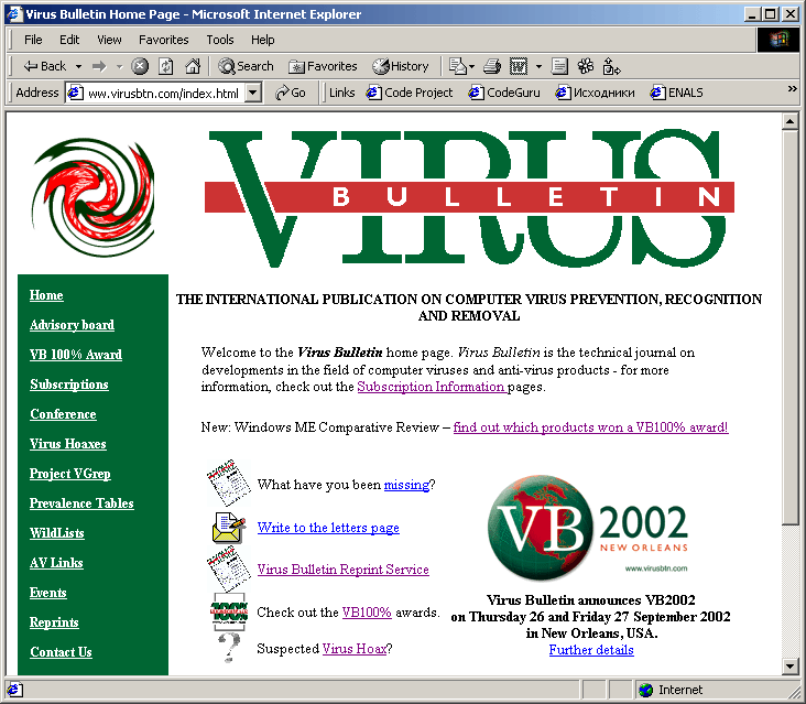 Рис. 1. Web-сайт журнала Virus Bulletin Авторитет журнала Virus Bulletin обеспечивается тем, что в его подготовке, а также в проведении сравнительного тестирования и конкурсов участвуют эксперты в области антивирусной защиты с мировыми именами. Эти специалисты представляют многие ведущие компании, создающие средства антивирусной защиты или имеющие к этой проблеме самое непосредственное отношение, такие как Network Associates, Sophos Plc, Symantec Corporation, IBM Research, WildList Organization International, Aladdin Knowledge Systems Ltd и другие. Отечественных разработчиков антивирусных программ в этом журнале представляет Евгений Касперский, создатель известного антивируса AVP. С полным списком экспертов можно познакомится на Web-сайте журнала. Помимо тестирования, журнал проводит ежегодные конференции, посвященные проблемам защиты от вирусов. В этих конференциях принимают участие ведущие специалисты, принимающие самое непосредственное участие в создании антивирусных программ и систем. Награда VB100%В спорте на финише участников соревнования могут разделять десятые и сотые доли секунды. Современные антивирусные программы, созданные ведущими специалистами в этой области, также "финишируют" практически одновременно. В январе 1998 года журнал Virus Bulletin приступил к проведению конкурсов, целью которых стало определение антивирусных продуктов, наилучшим образом выполняющих свои функции на момент проведения конкурса. В это же время была учреждена награда VB100%, которой отмечаются антивирусы, способные наилучшим образом обнаруживать "живые" вирусы, встречающиеся в реальной жизни. При этом учитываются самые новые, только что созданные вирусы, собранные организацией WildList Organization International по всему миру, а не из одного или нескольких мест. Именно такие вирусы представляют собой наибольшую угрозу. Если информация о новом вирусе не содержится в базе данных программы, антивирус может его так и не обнаружить. Приз и логотип VB 100% (рис. 2) присуждается тем антивирусам, которые смогли обнаружить все "живые" вирусы, как в режиме сканирования по запросу, так и в режиме сканирования при обращении к файлу.