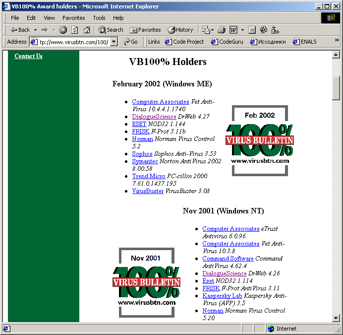 Рис. 2. Страница конкурса VB100% Holders Помимо способности обнаружения вирусов, устроители конкурса VB 100% проверяют и такие параметры, как скорость сканирования, а также ухудшение производительности системы, вызванной сканированием файлов при обращении к ним. Награда VB 100% не присуждается антивирусам, допустившим хотя бы одно ложное срабатывание по вирусной базе (подозрения эвристика здесь не учитываются). Выбирая антивирус для своей системы, убедитесь, что он периодически завоевывает награду VB100%. Это гарантирует, что разработчики антивируса постоянно контролируют появление новых опасных вирусов, своевременно обновляют антивирусную базу данных и совершенствуют алгоритмы обнаружения вирусов. Сравнительный обзор журнала Virus BulletinСам по себе факт присвоения награды VB100%, безусловно, говорит о высоком качестве антивирусной программы. Однако, прослеживая историю присвоения этих наград за более или менее продолжительный период времени, можно получить более полное представление о достоинствах того или иного антивируса. Начиная с января 1998 года, на Web-сайте журнала Virus Bulletin публикуется в табличном виде результаты проведения конкурса VB100% (рис. 3). При этом в расчет принимаются 6 последних проведенных тестов, в результате чего предпочтение отдается более новым наградам.