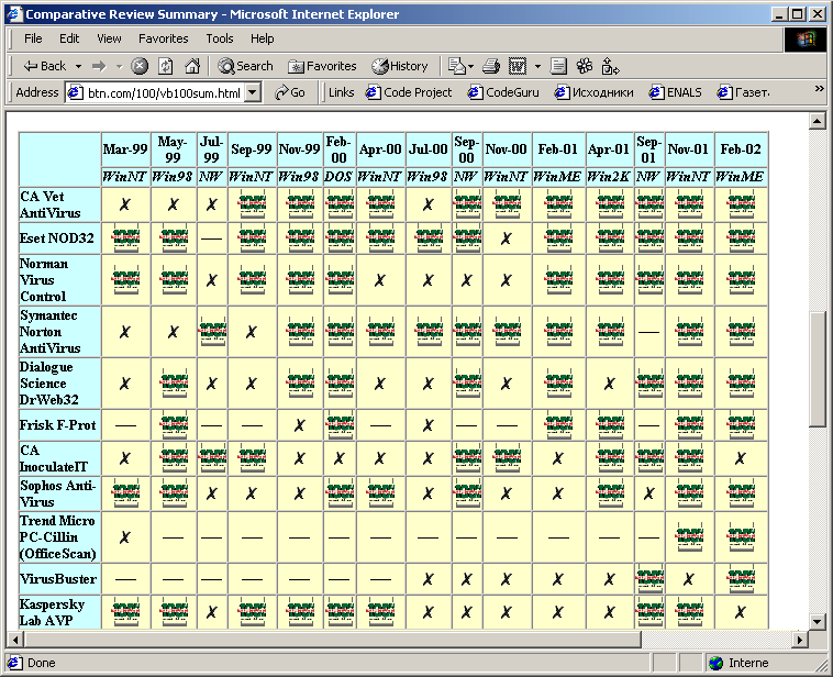Рис. 3. Сравнительный обзор протестированных антивирусов В таблице указывается дата выпуска журнала Virus Bulletin, в котором опубликованы детальные результаты тестирования, а также тип операционной системы, в среде которой проверялась работа антивируса. При составлении таблицы в ее верхней части упомянуты антивирусы, завоевавшие максимальное количество наград за последние 12 месяцев (т.е. получившие 6 наград). Если было завоевано одинаковое количество наград, приоритет получают те антивирусы, которые завоевали эти награды последними. Если же награды завоеваны одновременно, места в таблице распределяются по алфавиту. Коллекционные вирусыЗаметим, что помимо обычных, "живых" вирусов, существуют еще и так называемые коллекционные, или лабораторные вирусы. Эти вирусы создавались в исследовательских или демонстрационных целях и не встречаются в реальных компьютерных системах. Очевидно, при проведении сравнений приоритет должен отдаваться "живым", а не коллекционным вирусам.  |