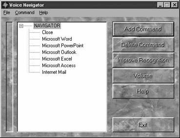 6. Системы распознавания и обработки речи Хотя эта глава и называется «Системы распознавания речи», в ней мы рассмотрим готовые программы и системы несколько более широкого класса. Это программы голосового управления компьютером, домашним и офисным оборудованием, мобильным телефоном, системы голосового разграничения доступа и другие системы, в которых применяются современные речевые технологии. Мы расскажем о следующих программах и системах, в которых применяются речевые технологии: · программы голосового управления компьютером VoiceNavigator, Truffaldino; · библиотека распознавания голосовых команд VoiceCom; · комплекс DiVo; · систему голосового разграничения доступа, разработанную компанией «Центр речевых технологий»; · программы документирования устных выступлений — компьютерный транскрайбер, системы Нестор и Аллегро; · программы диктовки текста DragonDictate и Dragon NaturallySpeaking; · систему распознавания речи, встроенную в пакет Microsoft Office XP. Скажем сразу, что когда мы работали над этой книгой, нам не удалось найти ни одной доступной и хорошо работающей системы распознавания русской речи. Поэтому мы будем рассказывать о системах диктовки текста, рассчитанных на английский язык в надежде на то, что аналогичные средства в обозримом будущем появятся и для русского языка. Что же касается синтеза русской речи, то, как Вы увидите из следующей главы, такие системы уже существуют и обладают вполне приемлемым «произношением». Все системы голосового управления компьютером и другим оборудованием можно условно разделить на два класса. К первому классу мы будем относить устройства, назначением которых является облегчение работы с компьютером. Такие устройства используются в качестве дополнительного канала управления наряду с основными и традиционными каналами — клавиатура и мышь, а также экран компьютера (который служит каналом обратной связи). В устройствах второго класса речевой интерфейс является основным и единственным. Эти устройства доступны тем, кто не может работать с клавиатурой и экраном компьютера либо из-за проблем со здоровьем, либо из-за чрезмерной занятости какой-либо работой (например, управлением автомобилем или самолетом). В этом разделе мы рассмотрим несколько систем голосового управления, созданных в компании «Центр речевых технологий», которую мы упоминали в 3 главе нашей книги. Это программы VoiceNavigator и Truffaldino, библиотека распознавания голосовых команд VoiceKeyKit и система DiVo управления мобильным телефоном в автомобиле без использования рук (hands-free car kit). Все они, кроме последней, относятся к первому классу, т.к. для работы с ними необходимы традиционные средства ввода и вывода информации. Систему DiVo управления мобильным телефоном в автомобиле можно отнести ко второму классу — для работы с этой системой не нужен ни компьютер, ни экран, ни клавиатура. Программа VoiceNavigator Программа VoiceNavigator (рис. 6-1) является типичным представителем программ голосового управления компьютером. Она позволяет пользователю запускать приложения голосом, не дотрагиваясь до клавиатуры, и выполнять произвольно заданные команды.