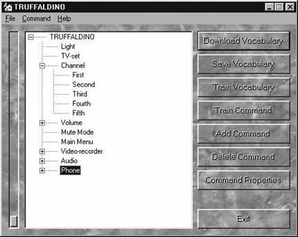 Рис. 6-1. Программа VoiceNavigator Перед использованием программы VoiceNavigator ее необходимо обучить, произнеся в микрофон слова команд. Так как программа VoiceNavigator распознает команды по образцам, то команды можно произносить на любом языке и любым голосом. Чтобы программа начала распознавать голосовые команды, ее необходимо «разбудить», произнеся ключевое слово. После этого программа будет реагировать только на Ваши команды, игнорируя остальные звуки. В программе есть функция голосового ответа-подтверждения команд. Эта функция позволяет убедиться, что Ваша команда распознана системой и готова для выполнения. Программа VoiceNavigator нетребовательна к ресурсам компьютера. Вы можете использовать ее в компьютере, оборудованном процессором с тактовой частотой 200 МГц или выше, причем для ввода звуковых команд подойдет любой звуковой адаптер, например, Creative Sound Blaster. Программа Truffaldino Программа Truffaldino (рис. 6-2) предназначена для управления домашним или офисным оборудованием, таким как телевизор, домофон, видео-магнитофон, аудио-система, кондиционер, микроволновая печь, система освещения, телефон и т.п.