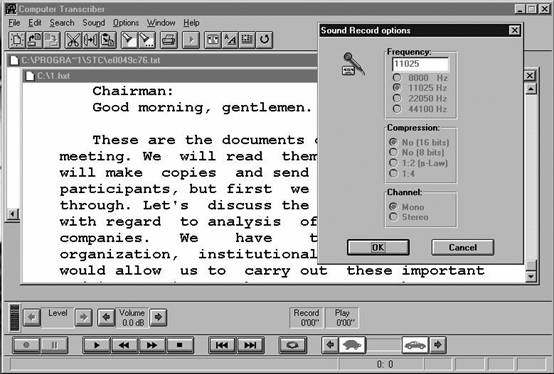 Рис. 6-4. Транскрайбер Что может компьютерный транскрайбер? Прежде всего, транскрайбер автоматически осуществляет высококачественный ввод в компьютер речевых сигналов, поступающих с линейного выхода магнитофона, диктофона или иной звуковоспроизводящей аппаратуры. При этом обеспечивается высокое качество звука, необходимое для выполнения таких работ, как, например, идентификация диктора по голосу в ходе проведения криминалистических экспертиз. Транскрайбер, созданный в компании «Центр речевых технологий», способен не просто записывать звуковой сигнал, но и очищать его от шума. Это упрощает работу с фонограммами, сделанными в плохих акустических условиях. Записанный звуковой сигнал хранится на жестком диске компьютера. Если проводить своевременное резервное копирование данных, то при таком способе хранения достигается гарантия полной сохранности сделанной звукозаписи. Что же касается обычных магнитофонных лент, то по мере проигрывания и хранения качество записанного на них звука быстро ухудшается. Одновременно с записью звукового сигнала осуществляется его воспроизведение. Встроенный цифровой магнитофон Компьютерный цифровой магнитофон транскрайбера может выполнять различные функции, характерные для профессиональных диктофонов и магнитофонов: · регулировка уровня записи и воспроизведения фонограмм; · остановка воспроизведения с откатом; · мгновенная перемотка; · прослушивание в режиме «кольца»; · работа по меткам времени; · замедленное и ускоренное воспроизведение без искажения тембра голоса; · сверка фрагментов текста и соответствующих фрагментов речевой фонограммы Замедленное воспроизведение речи, выполняемое без искажения тембра голоса (характерного для обычных магнитофонов) позволяет работать с неразборчивыми речевыми фрагментами. С этой целью можно также запустить многократное воспроизведение одного и того же фрагмента речи в режиме «кольца». Ускоренное воспроизведение дает возможность пропустить паузы или малозначительные участки фонограммы, а также позволяет находить нужные фрагменты записанной речи. Транскрайбер предоставляет оператору весьма полезную возможность сверки набранного текста и соответствующего этому тексту фрагмента фонограммы. При этом связь текста и речи устанавливается автоматически. Если оператор укажет курсором мыши фрагмент текста, транскрайбер автоматически найдет соответствующий звуковой фрагмент речевого сигнала для прослушивания и сверки с текстом. Что касается аппаратного обеспечения компьютерного транскрайбера, то он может поставляться с профессиональным звуковым адаптером или обычным звуковым адаптером, таким, например, как Creative Sound Blaster. Дополнительно транскрайбер может комплектоваться ножной педалью для управления функциями цифрового магнитофона. Текстовый редактор, встроенный в компьютерный транскрайбер, способен автоматически форматировать текст, расставлять переносы и работать с блоками текста. Для ускорения выполнения однотипных операций, таких как вставка заранее подготовленных фрагментов текста, можно создавать макрокоманды. В состав текстового редактора может входить система автоматической проверкой орфографии русского языка, созданная компанией «Информатик». Описанный выше компьютерный транскрайбер предназначен для испо