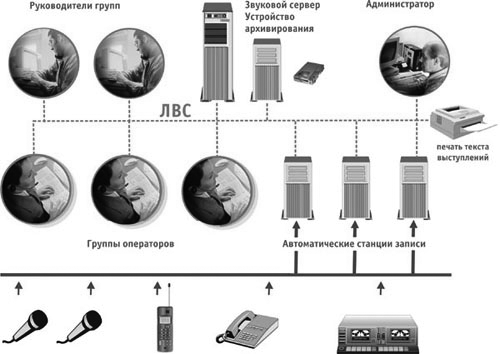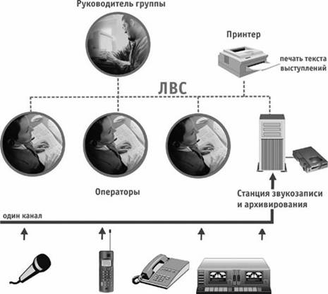 Рис. 6-5. Система Нестор Как работает система Нестор? Поступающий на ее вход речевой сигнал записывается на жесткий диск компьютера. Затем он разбивается на фрагменты и распределяется между операторами-стенографистами, выполняющими его прослушивание и расшифровку. Полученные таким образом участки текста автоматически соединяются в единый документ, который после проверки может быть сохранен и распечатан. Система «Аллегро» цифровой звукозаписи и оперативной текстовой расшифровки устных выступлений и фонограмм речи по принципу распределенной обработки (стенографирования) также создана компанией «Центр речевых технологий» (рис. 6-6).