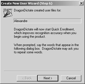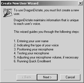 Рис. 6-7. Создание профиля для нового пользователя Здесь перечислены действия, которые нужно будет выполнить пользователю при установке программы. Пользователь должен ввести свое имя, указать тип своего голоса, правильно расположить, настроить и проверить микрофон и запустить процедуру быстрой настройки программы на голос говорящего. Имя пользователя вводится в диалоговом окне, показанном на рис. 6-8.
