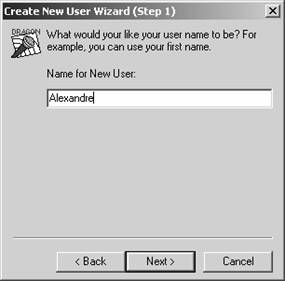 Рис. 6-8. Имя нового пользователя В дальнейшем можно будет добавить других пользователей, выполнив индивидуальную настройку программы на голос каждого пользователя. Эта возможность просто необходима, если с компьютером работают несколько пользователей, и всем им нужна система распознавания речи. Далее для нового пользователя нужно выбрать тип голоса (рис. 6-9).