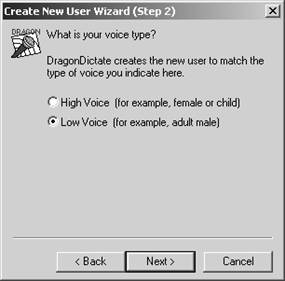 Рис. 6-9. Выбор типа голоса При этом выделяются голоса с высокой тональностью High Voice (женский и детский) и с низкой тональностью Low Voice (мужской). Далее мастер установки обращает внимание пользователя на необходимость правильного расположения микрофона, который должен находиться в уголке рта, как это показано на рис. 6‑10.