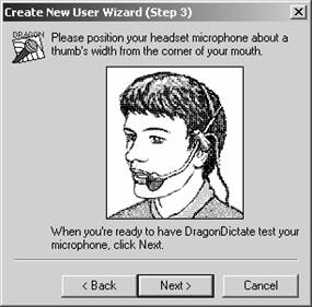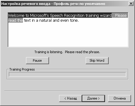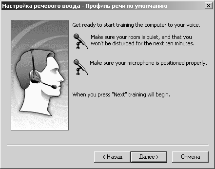 Рис. 6-28. Подготовка к тренировке Прежде всего, следует убедиться, что в помещении, где Вы находитесь, нет посторонних шумов, и что Вас не отвлекут от обучения. Лучше всего, если Вы будете находиться в комнате один на один с компьютером, отключив телефоны. Кроме того, нужно поместить микрофон в правильное положение. Лучше всего, если микрофон будет находиться на небольшом расстоянии от уголков губ, но не прямо перед губами. Последнее требование позволит избавиться от шума выдыхаемого при разговоре воздуха. Убедившись, что условия для обучения подходящие, щелкните кнопку Далее для запуска процесса обучения. На экране появится диалоговое окно, показанное на рис. 6-29.