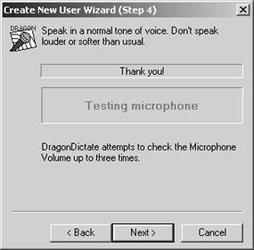 Рис. 6-11. Микрофон проверен Это нужно сделать голосом с нормальной громкостью, не увеличивая громкость или не уменьшая ее специально. После настройки на экране появляется окно мастера с сообщением о том, что профиль пользователя был успешно создан, и теперь надо переходить в режим обучения Quick Enrollment для настройки системы распознавания речи на голос пользователя (рис. 6-12).