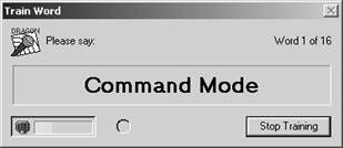 Рис. 6-13. Режим обучения В этом окне появляются фразы, которые нужно произносить в микрофон один, два или три раза. По мере выполнения этой процедуры в нижней части окна «зажигаются» зеленые лампочки, сигнализирующие об удачной попытке обучения. Другое окно (рис. 6-14) играет роль управляющей консоли.