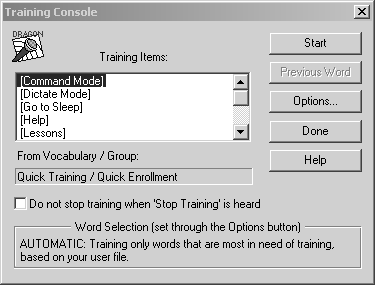 Рис. 6-21. Обучение системы распознавания Щелкнув кнопку Start для начала обучения, Вы увидите окна, показанные ранее на рис. 6-13 и 6-14. При помощи этих окон Вам нужно будет обучить программу DragonDictate распознавать слова, относящиеся к четырем группам: · слова для исправления ошибок; · команды; · слова для режима диктовки; · дополнительные слова. В любой момент Вы можете отредактировать словарь команд, который используется программой DragonDictate. Для этого нужно запустить приложение Vocabulary Manager, главное окно которого показано на рис. 6-22.