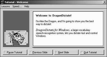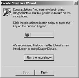 Рис. 6-16. Мастер настройки параметров завершил свою работу Для завершения работы мастера щелкните кнопку Finish. Прежде чем работать с любой существующей системой распознавания голоса, необходимо прочитать документацию к этой системе или пройти небольшой курс обучения. В комплекте с программой DragonDictate поставляется специальный интерактивный учебник. Этот учебник не только рассказывает о работе с системой, но и дает возможность попрактиковаться в выполнении основных действий (рис. 6-17).