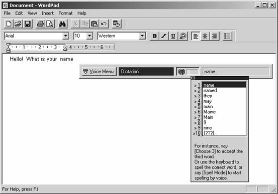 Рис. 6-19. Результат выполнения команды Wake Up. Как мы уже говорили, программа DragonDictate может работать в двух режимах — в командном режиме и в режиме диктовки. Для переключения программы в командный режим необходимо произнести команду Command Mode, а для переключения в режим диктовки — команду Dictate Mode. Как мы только что сказали, для переключения в режим диктовки необходимо выдать голосовую команду Dictate Mode. Однако перед этим при помощи голосовой команды Вы можете запустить приложение, в котором будет создаваться или редактироваться текстовый документ. Например, для запуска программы Word можно выдать команду BringUp Word. Далее нужно будет диктовать текст по словам, произнося из раздельно. Вставка знаков препинания выполняется при помощи голосовых команд. Диктовать нужно с обычной громкостью. Распознавая слова, программа DragonDictate предлагает пользователю выбрать нужное слово из списка слов с похожим звучанием (рис. 6-20).