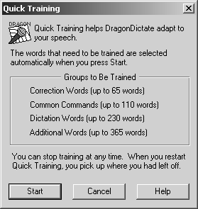 Рис. 6-20. Диктовка текста для приложения WordPad Выбор можно сделать мышью или голосом, произнеся команду типа Choose 1 (для выбора первого варианта из предложенного списка), Choose 2 (для выбора второго варианта) и т.д. Дополнительное обучение произношению слов Если программа DragonDictate плохо понимает произносимые Вами слова, проведите ее дополнительное обучение. На это обучение, однако, может уйти немало времени, так как Вам будет предложено произнести более 700 слов. К счастью, процесс обучения можно прервать в любой момент и затем продолжить с прерванного места. Для запуска обучения щелкните левой клавишей мыши меню Voice Menu, расположенное в левой части голосовой инструментальной панели (рис. 6-19) и выберите из меню Tools строку Quick Training. На экране появится одноименное диалоговое окно, показанное на рис. 6-21.