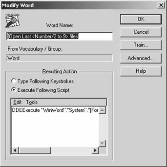 Рис. 6-23. Редактирование команды Щелкнув кнопку Train, можно обучить программу DragonDictate распознавать данную команду. Элементы управления, расположенные в группе Resulting Action, позволяют назначить команде то или иное действие. Если отмечен флажок Type Following Keystrokes, в результате выполнения команды будет имитироваться нажатие заданной комбинации клавиш. При помощи флажка Execute Following Script можно сопоставить команде любой программный сценарий, например, команду запуска приложения или выдачу команды приложению при помощи программного интерфейса динамического обмена данными (Dynamic Data Exchange, DDE), как это показано на рис. 6-23. Программа Dragon NaturallySpeaking Когда мы работали над этой книгой, стала доступна новая версия программы распознавания речи Dragon NaturallySpeaking стоимостью около $200. Эта программа расширяет и дополняет возможности только что описанной программы DragonDictate. Разработкой этой программы занимается компания ScanSoft. Программа Dragon NaturallySpeaking устанавливается и настраивается аналогично программе DragonDictate. На этапе обучения пользователю предлагается прочитать в микрофон небольшой отрывок текста, после чего программа запоминает особенности его голоса. Можно потренировать программу подольше, дополнив базовый словарь, содержащий сотни тысяч слов. При обучении предусмотрена возможность импортирования словосочетаний, а также слов из офисных документов и документов HTML. При установке можно выбрать язык распознавания (рис. 6-24), но, к сожалению, даже эта новая версия программы не может работать с русским языком.