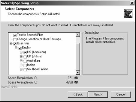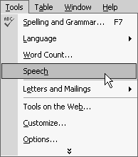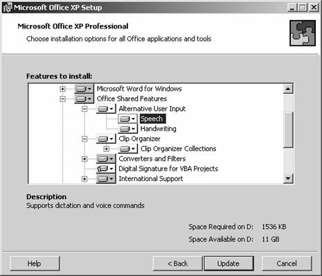 Рис. 6-25. Установка модулей распознавания и синтеза речи Если Вы уже установили пакет Microsoft Office XP без речевых компонентов, это можно сделать при помощи меню Tools любого офисного приложения, например, Microsoft Word или Microsoft Excel. Выберите из этого меню строку Speech (рис. 6-26), после чего следуйте инструкциям, появляющимся на экране. Средства работы с речью будут установлены и станут доступны во всех приложениях Microsoft Office XP.