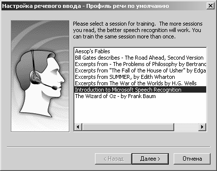 Рис. 6-27. Тренировка системы распознавания речи Здесь Вам предлагается на выбор прочитать в микрофон один из восьми текстов. В процессе чтения система распознавания речи настроится на Ваш голос. При необходимости позже можно будет выполнить дополнительное обучение, прочитав все остальные тексты. Чем больше времени Вы затратите на обучение, тем лучше компьютер будет «понимать» Вашу речь. Во второй диалоговой панели, показанной на рис. 6-28, мастер обучения подсказывает Вам, в каких условиях необходимо проводить обучение.
