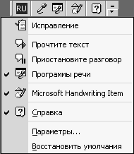 Рис. 6-32. Меню панели Language Bar С помощью строк этого меню можно выполнить исправление в тексте, введенного при помощи голоса (строка Исправление), запустить синтезатор речи для чтения выделенного фрагмента текста (Прочтите текст) или приостановить работу этого синтезатора (Приостановите разговор). Для работы с программами распознавания и синтеза речи выберите в этом меню строку Программы речи, чтобы слева от этой строки появилась галочка. Если в панели Language Bar щелкнуть кнопку Программы (третья слева на рис. 6-31), на экране появится меню речевых программ, показанное на рис. 6-33.