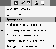 Рис. 6-26. Включение речевого ввода Обучение системы распознавания речи Система распознавания речи, встроенная в пакет Microsoft Office XP, требует обучения на голос пользователя. Если Вы только что установили речевые компоненты, то на экране появится первое диалоговое окно мастера обучения, показанное на рис. 6-27.