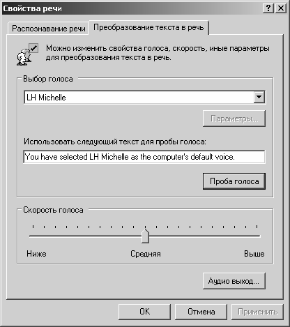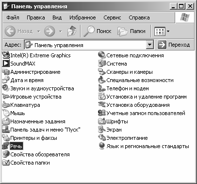 Рис. 6-34. Аплет в управляющей панели для настройки параметров речи На экране появится диалоговое окно Свойства речи, показанное на рис. 6-35.