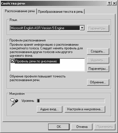 Рис. 6-35. Настройка свойств речи В этом окне имеются две вкладки — Распознавание речи и Преобразование текста в речь. Первая из этих вкладок позволяет выбирать модули распознавания речи и настраивать параметры их работы, а вторая — делать те же самые действия для программных модулей синтеза речи. В поле Язык имеется список модулей распознавания речи. В комплекте с американским пакетом Microsoft Office XP поставляется только один такой модуль с названием Microsoft English ASR Version 5 Engine, который, увы, работает только с английским языком. Его параметры не поддаются настройке. Вы, однако, можете настроить параметры индивидуальных профилей, создаваемых для пользователей компьютера. По умолчанию создается один такой профиль, дополнительные профили можно добавить при помощи кнопки Создать. С помощью кнопки Обучение можно запустить обучение распознаванию речи для любого выбранного профиля (при установке Вы уже выполнили такое обучение для профиля по умолчанию). Настройка параметров профиля выполняется при помощи кнопки Параметры. Соответствующее диалоговое окно Recognition Profile Settings показано на рис. 6-36.