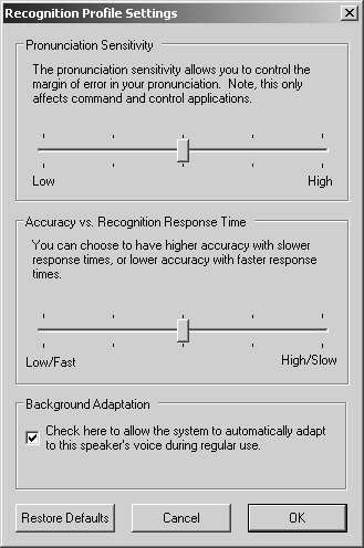 Рис. 6-36. Настройка профиля распознавания речи В окне настройки профиля распознавания речи Вы можете регулировать чувствительность к произношению (Pronunciation Sensitivity), выбрать оптимальный баланс между точностью и скоростью распознавания речи (Accuracy vs. Recognition Response Time). Кроме того, можно включить режим фоновой адаптации системы распознавания речи к голосу диктора (флажок Background Adaptation). Если компьютер оснащен мощным процессором, можно сделать выбор в пользу лучшего качества распознавания речи. Режим адаптации позволит системе постепенно «привыкать» к голосу пользователя, улучшая качество распознавания. Вернувшись к диалоговому окну, показанному на рис. 6-35, заметим, что здесь прим помощи кнопки Настройка микрофона можно запустить мастер настройки микрофона. Напомним, что от правильного выбора и настройки параметров микрофона в немалой степени зависит качество распознавания речи. Первое окно мастера настройки микрофона показано на рис. 6-37.