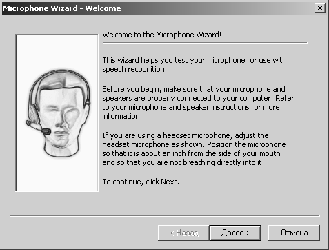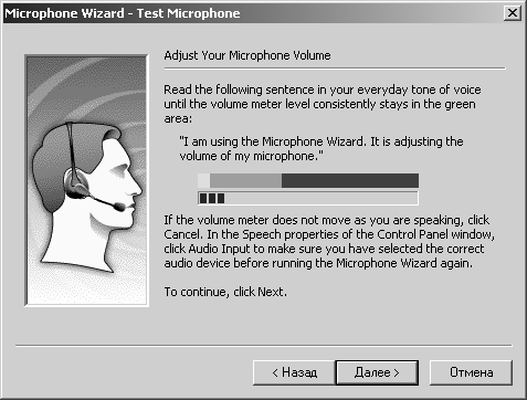 Рис. 6-37. Мастер настройки микрофона Здесь Вам рекомендуется проверить подключение микрофона и расположить его правильным образом около рта. Щелкнув кнопку Далее, Вы попадете во второе окно мастера настройки микрофона, показанное на рис. 6-38.