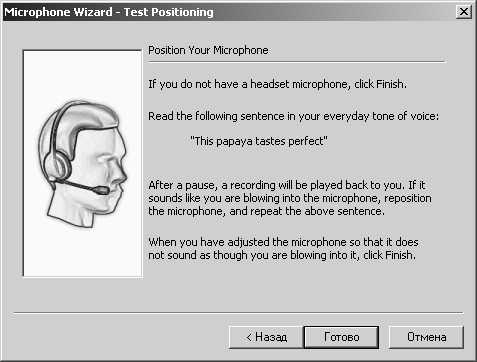 Рис. 6-39. Проверка настройки микрофона Здесь Вам нужно произнести обычным голосом предложение «This papaya tastes perfect». Ваш голос будет записан и через некоторое время воспроизведен через головные телефоны. Убедитесь, что при воспроизведении записанное предложение звучит именно так, как Вы его произносили. В противном случае отрегулируйте громкость или повторите регулировку чувствительности микрофона. О принципах работы синтезаторов речи и программах синтеза речи мы расскажем в следующих главах нашей книги. Однако, забегая вперед, скажем, что при помощи вкладки Преобразование текста в речь диалогового окна Свойства речи (рис. 6-40) можно настроить некоторые параметры работы синтезатора речи.